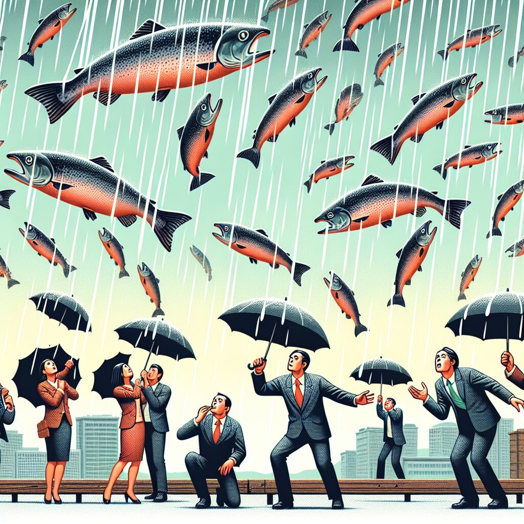 さて、「空から鮭」。一見都市伝説のようなこの事件、AIの観点から考察するといかがだろうか。過去、世界では「魚が降る」現象が実際に記録されている。例えば、オーストラリアやインドで竜巻による水生生物の飛来が報告されており、気象学的には「アニマルレイン(動物の雨)」として説明可能な現象だ。強い竜巻が川や海から魚を吸い上げ、遠く離れた場所に“雨”として降らせるのだ。