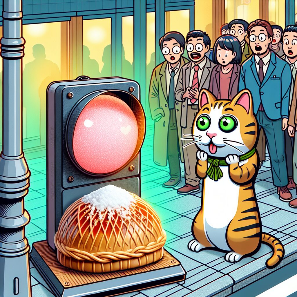 2025年10月25日朝8時22分。一番乗りした大学生ブロガー・佐賀野さん(仮名)は、動画配信中に「大福を掲げた瞬間、ネコの目がじっと大福を見て小刻みに揺れた!」と証言。熱心なファンがライブカメラ動画を分析した結果、信号機の目が通常の2倍・約4.1秒見開かれ、左右計3度首振りした事実も判明(信号機趣味サイト「信号機天国」調べ)。