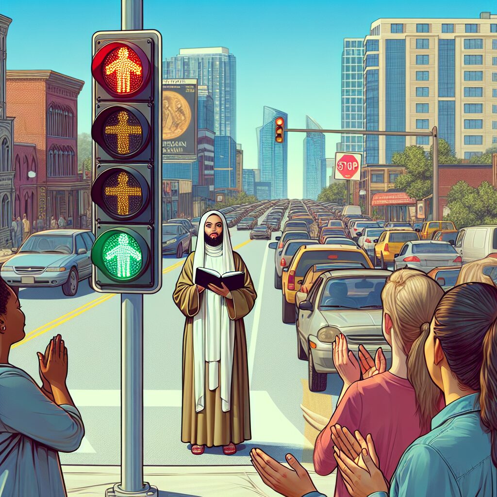 2025年11月初旬、地方都市・北町市の主要交差点で「赤信号で説法」を始めた女性が短時間で大きな話題を呼んだ。白い衣装に身を包んだその「偽の聖女」は、車列が止まる赤信号の横断歩道に立ち、通行人に向けて短い説教(?)を行ったところ、通行人の一部が拍手で応え、スマホで撮影する人が続出。結果として同交差点は一時的に渋滞が発生し、SNS上で映像が拡散、再生数は数日で100万回を超えた。笑い話として受け取る向きもあれば、交通安全や公共秩序の観点から問題視する声も上がっている。